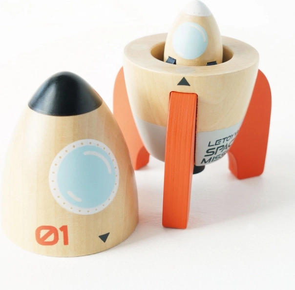 Zestaw kosmicznych rakiet od Le Toy Van to idealny prezent dla małych odkrywców. Ten drewniany komplet zawiera dwie rakiety – jedną większą z otwieranym magnetycznym wieczkiem oraz mniejszą rakietę w środku. Wszystkie elementy wykonano z drewna z certyfikatem FSC i pomalowano nietoksycznymi farbami na bazie wody, co czyni je bezpiecznymi dla dzieci.