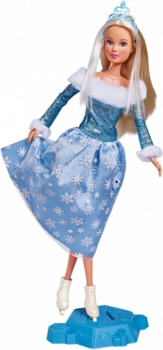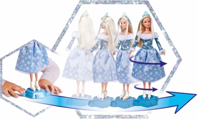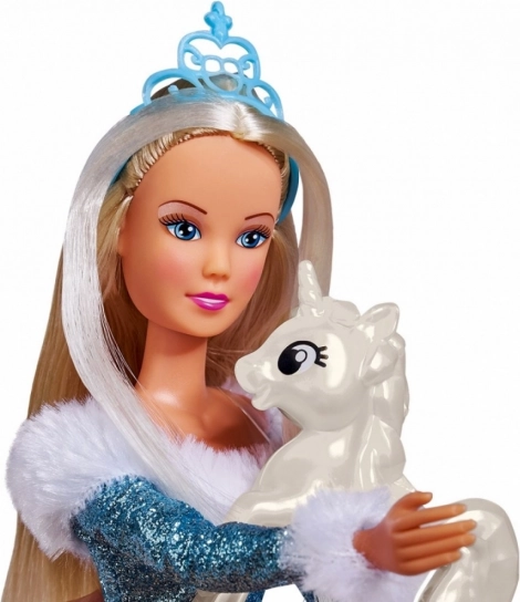 Błyszcząca niebiesko-biała sukienka ze śnieżnymi motywami, korona i stylowe detale zmieniają Steffi w prawdziwą zimową księżniczkę.
