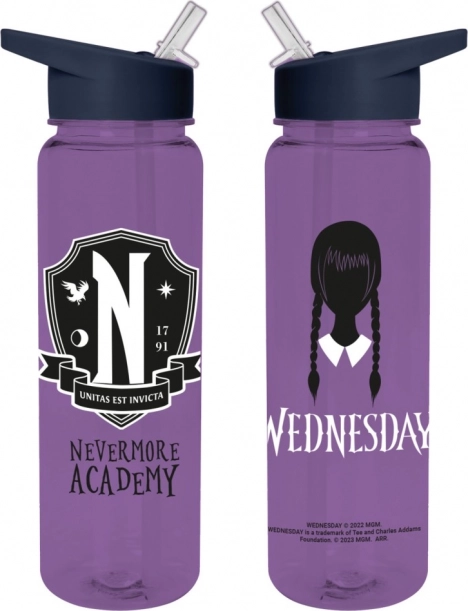 Ciesz się ulubionym napojem w tej plastikowej butelce ze specjalnym motywem Wednesday o pojemności 700 ml. Ta butelka jest idealna do codziennego użytku, gdy idziesz do pracy, szkoły lub na wycieczkę.