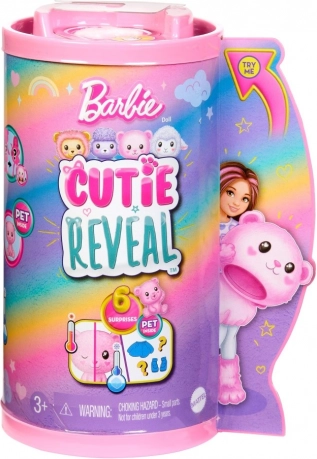 Lalka Barbie Chelsea Cutie Reveal zapewnia zabawę pełną rozpakowywania i odkrywania. W opakowaniu znajdziesz małą lalkę Chelsea ukrytą w pluszowym misiowym kostiumie, stylowe akcesoria oraz mini zwierzątko. Górną część kostiumu można po odwróceniu zmienić w puszystą kurtkę, a głowa kostiumu staje się legowiskiem dla zwierzątka.