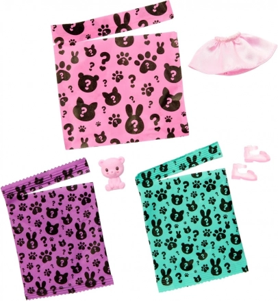 Otwórz trzy saszetki i odkryj satynową spódniczkę, parę bucików oraz urocze zwierzątko pasujące do kostiumu lalki.