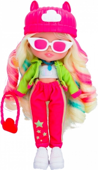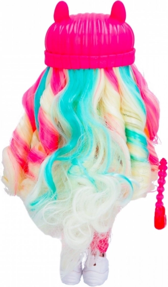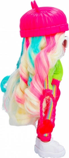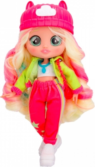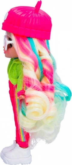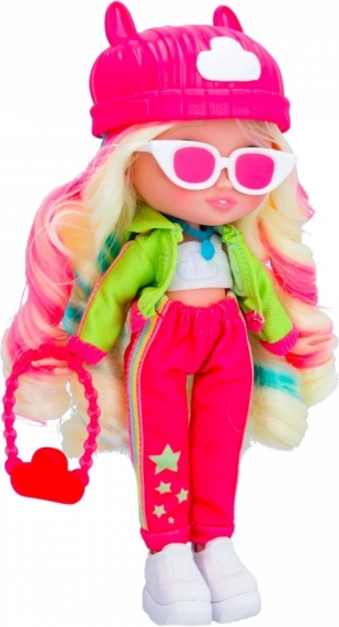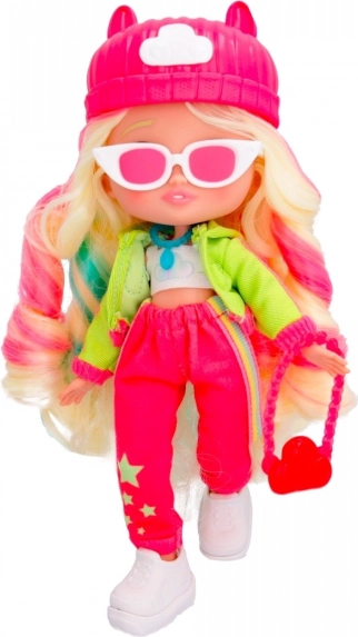 Lalka jest ubrana w modny strój, który obejmuje różowy kapelusz i wyraziste akcesoria, zapewniające jej niepowtarzalny wygląd.