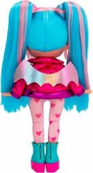Bruny nosi niebiesko‑różową kurtkę, top z sercem, legginsy w serduszka, stylowe buty i torebkę w kształcie serca – wszystko w żywych kolorach.