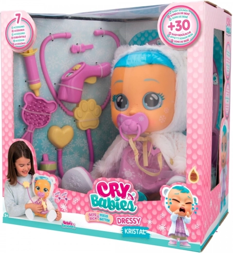 Lalka Cry Babies Kristal jest teraz dostępna w eleganckim stroju, który gwarantuje nowe wrażenia z zabawy. Reaguje na opiekę i czułość, naśladując prawdziwe niemowlę.