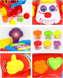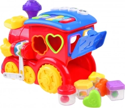 W zestawie znajdują się kolorowe i ponumerowane klocki, które dziecko dopasowuje do odpowiednich otworów w lokomotywie. Każdy klocek przedstawia owoc oraz cyfrę lub literę, co wspiera naukę. Dzięki tym interaktywnym elementom lokomotywa staje się świetnym narzędziem do rozwijania umiejętności motorycznych i logicznego myślenia.