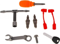 Zestaw zawiera dziecięce narzędzia: śrubokręt krzyżakowy, klucz 3 w 1 (nasadowy + płaski + krzyżakowy), klucz 2 w 1 (płaski + oczkowy) oraz inne akcesoria. Dzieci bezpiecznie poćwiczą podstawowe czynności mechaniczne.