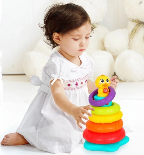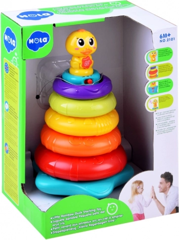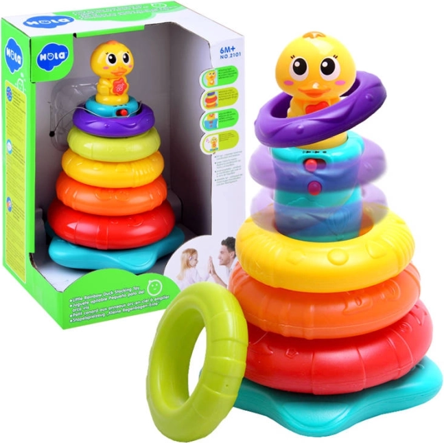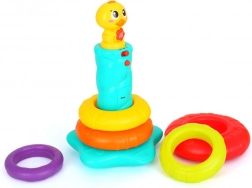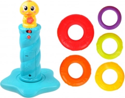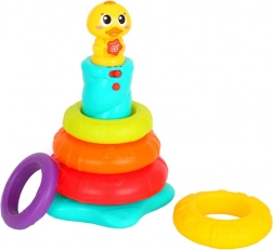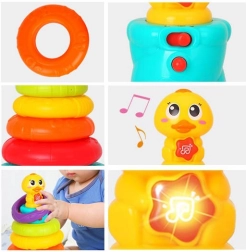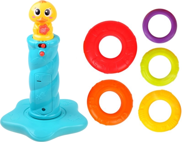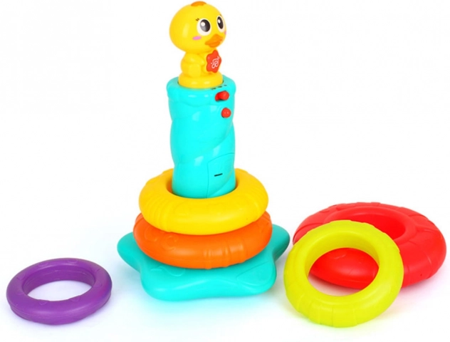 Interaktywna wieża do układania z kaczuszką przynosi dzieciom radość z odkrywania. Pięć kolorowych krążków nakłada się na stabilny palik z głową kaczuszki, która podczas zabawy wydaje zabawne dźwięki i kumkanie oraz zapala migające światełko. Gdy dziecko chwilę się nie bawi, kaczuszka wesołymi dźwiękami przypomina o sobie i zachęca do eksploracji.