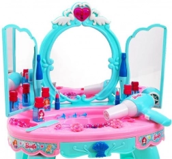 Interaktywna toaletka ucieszy małe miłośniczki mody i urody. Wykonana z solidnych i bezpiecznych materiałów w delikatnych pastelowych odcieniach różu i turkusu, dzięki czemu wygląda przyjaźnie i elegancko. Naciśnięcie serduszka nad lustrem aktywuje delikatne diody LED i melodie, które tworzą bajkowy nastrój.