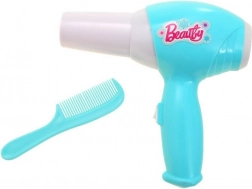 W zestawie znajduje się dziecięca suszarka na baterie, grzebień, biżuteria oraz imitacje kosmetyków – wszystko do realistycznej i kreatywnej zabawy.