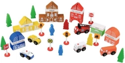 Kostki mają przyjemną teksturę i są odpowiednio duże dla małych rączek. Przykładowe wymiary: budynki (ok. 3cm x 6cm x 3cm), karetka (3,5cm x 5cm x 3cm), wóz strażacki (5,5cm x 8,5cm x 3cm), policja (4cm x 6cm x 3cm), postacie (5cm x 2,5cm x 1cm), znaki drogowe (wysokie 7cm) wykonane z plastiku.