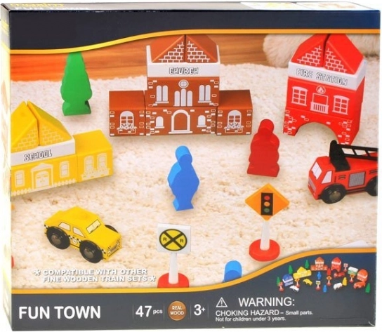 Zawiera klocki do budowy całej wioski, w tym straży pożarnej, szkoły i banku.