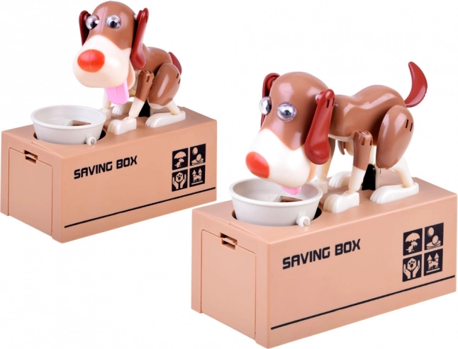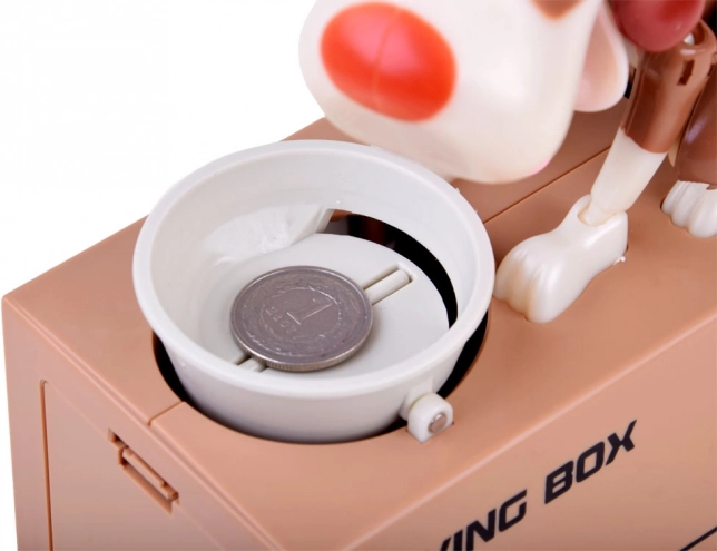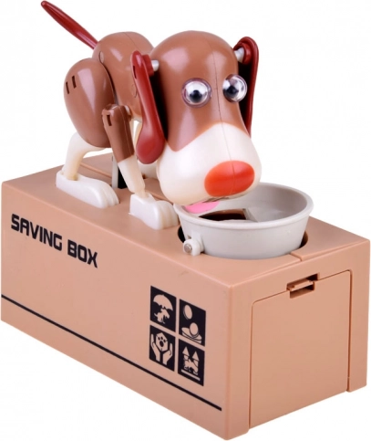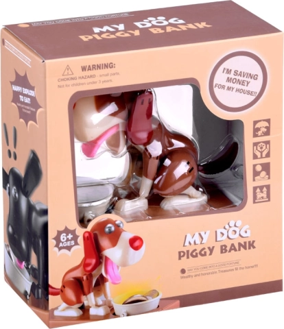 Wrzuć monetę do miski przed psem. Pies zaczyna się poruszać, jakby jadł z miski, co powoduje, że moneta wpada do skarbonki. Pies przy tym radośnie się rusza i potrząsa uszami. Do działania potrzebne są 3 baterie. Skarbonka pomoże dzieciom zrozumieć, że oszczędzanie jest nie tylko zabawne, ale także przynosi pozytywne efekty.