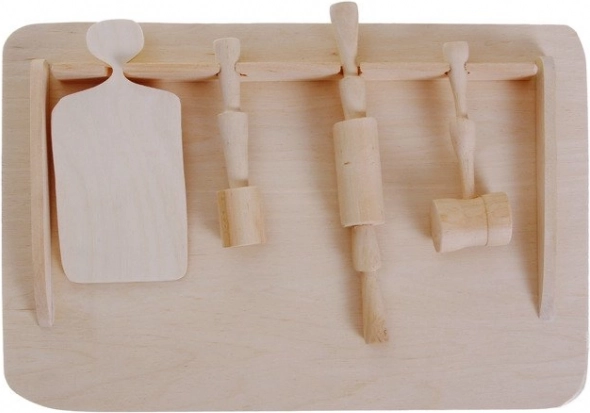 Zestaw zawiera wszystko, co potrzebne do prostych kuchennych aktywności i wspólnego spędzania czasu w kuchni. Świetnie rozwija zręczność, koordynację i samodzielność dziecka. Dla dłuższej trwałości drewno można przed pierwszym użyciem lekko zaimpregnować jadalnym olejem.