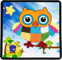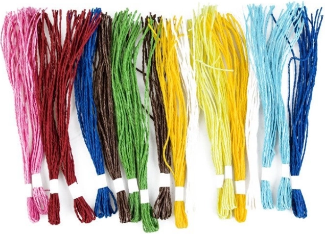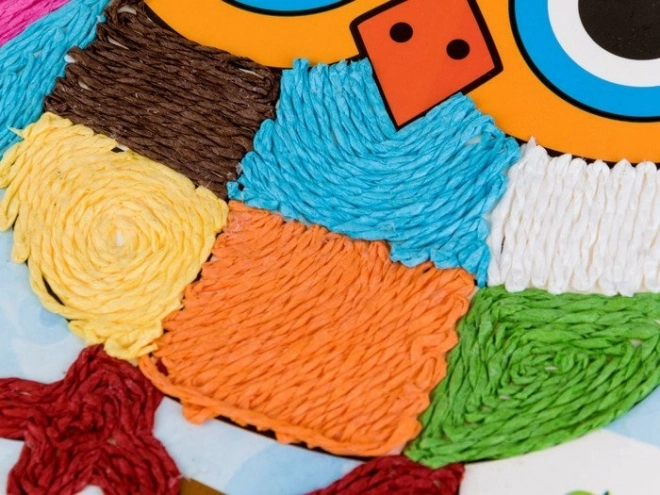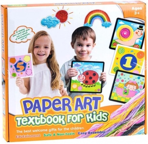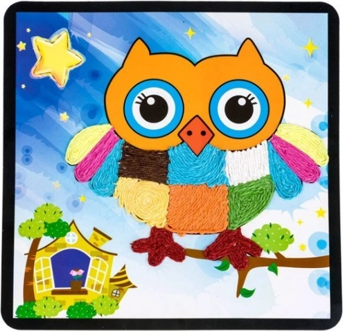 Zawiera kolorowe sznurki, obrazki do wypełniania, nożyczki i inne przybory do tworzenia.