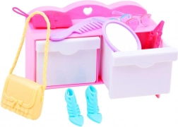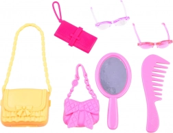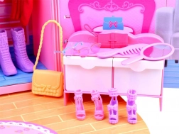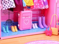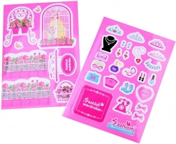 Zestaw obejmuje barwny wybór sukienek, butów, torebek, grzebień, lusterko oraz okulary, a także naklejki do personalizacji szafy. Nieskończone możliwości kombinacji.