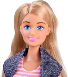 W zestawie znajdują się tekstylne ubranka w różnych kolorach i wzorach, kilka par butów, torebka oraz komplet plastikowych przyborów fryzjerskich. Dzieci ćwiczą małą motorykę, kreatywność i rozwijają wyobraźnię, tworząc nowe style i fryzury.