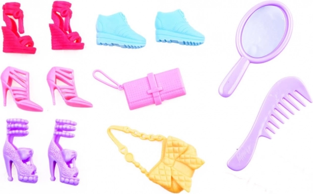 - Lalka, wiele elementów odzieży (sukienki, koszulki, spodnie), kilka par butów, torebka, akcesoria fryzjerskie (suszarka, prostownica, nożyczki, spryskiwacz), grzebień, lusterko