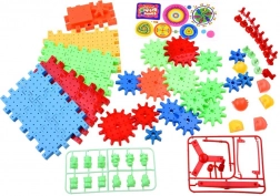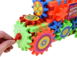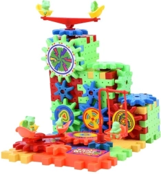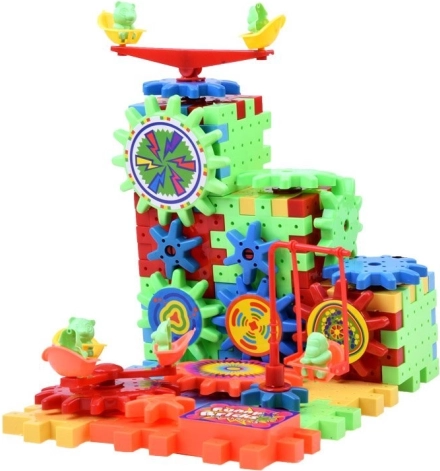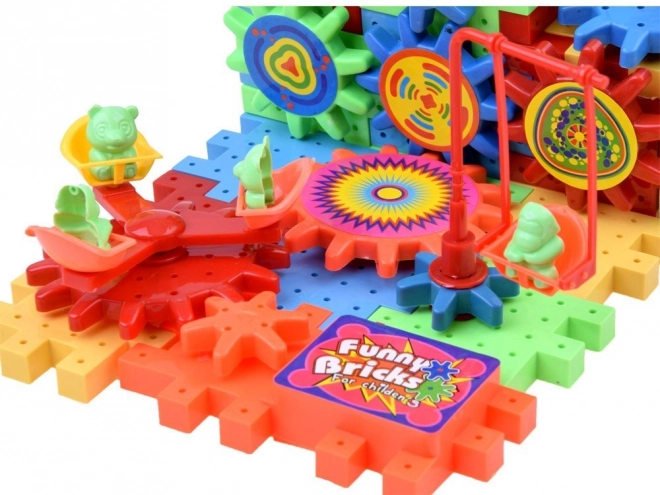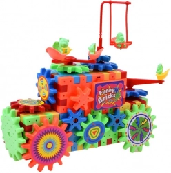 Zestaw zawiera kółko zębate zasilane baterią AA, które dzieci mogą używać do ożywienia budowli.