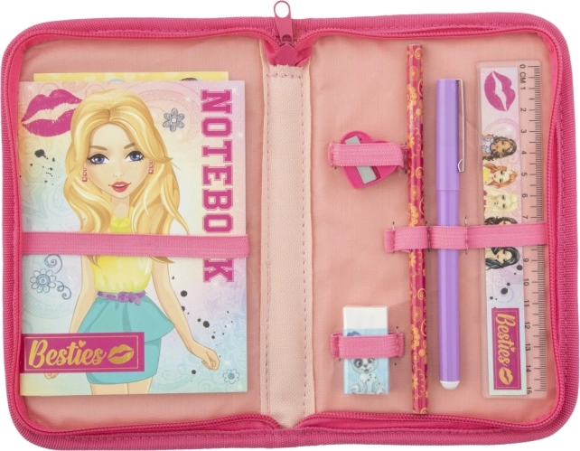 Wyrusz do szkoły z tym stylowym piórnikiem Besties, który zawiera wszystko, czego potrzebujesz: linijkę, temperówkę, długopis, ołówek, gumkę i notes.