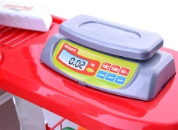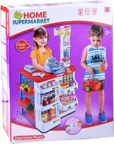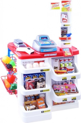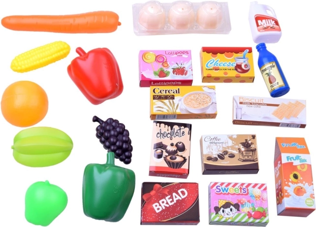 Zestaw zawiera różne rodzaje realistycznie wyglądających plastikowych produktów spożywczych, które dzieci mogą poznawać i używać w swoim wyimaginowanym sklepie.