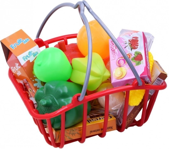 Praktyczny czerwony koszyk do przenoszenia drobnego towaru, który uczy dzieci organizacji i przenoszenia zakupów.