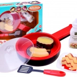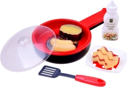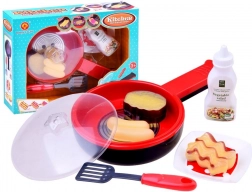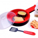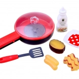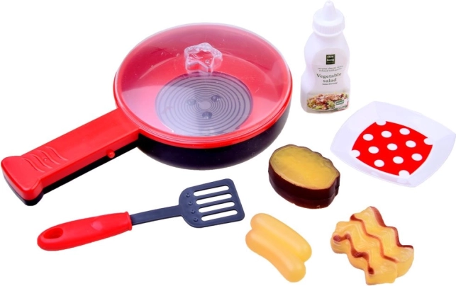 Zestaw zawiera patelnię, pokrywkę, kilka rodzajów potraw i akcesoria, które dzieci mogą wykorzystać podczas zabawy w gotowanie.