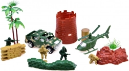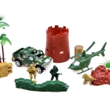 Zawiera realistycznie zaprojektowane elementy jak kamuflażowane namioty, wieże obronne i dekoracje terenowe, co dodaje autentyczności zabawie.