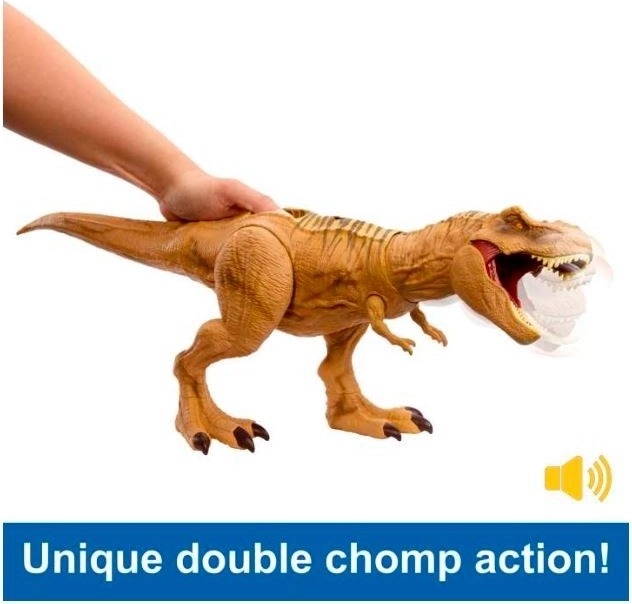 Po naciśnięciu przycisku T‑Rex otwiera paszczę i obraca głowę na bok, czemu towarzyszy realistyczny ryk dinozaura inspirowany filmami Jurassic World.