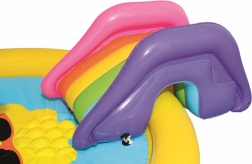 Miękka i stabilna zjeżdżalnia z tęczowym wzorem wspiera aktywną zabawę i można ją łatwo odpiąć w razie potrzeby.