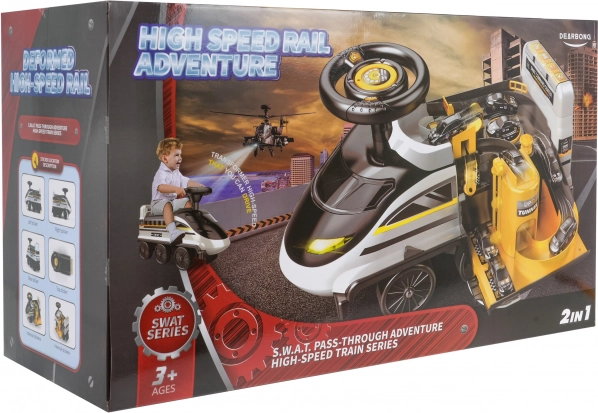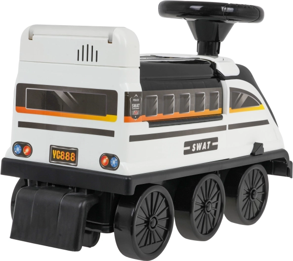 Interaktywny jeździk w kształcie lokomotywy zapewnia niezapomniane wrażenia z zabawy. Wykonany z wysokiej jakości, wytrzymałego i nietoksycznego plastiku. Jeździk porusza się na sześciu kołach, z których dwa przednie są skrętne. Pod siedziskiem znajduje się rozkładany policyjny park z rampami, ruchomą windą, otwieraną zaporą, podnośnikiem i obrotowym pokrętłem.