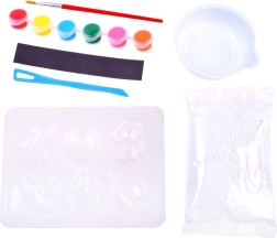 - Gips (ok. 150 g), miseczka do mieszania, mieszadełko, 6 farb akrylowych, pędzelek, taśma magnetyczna, instrukcja