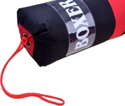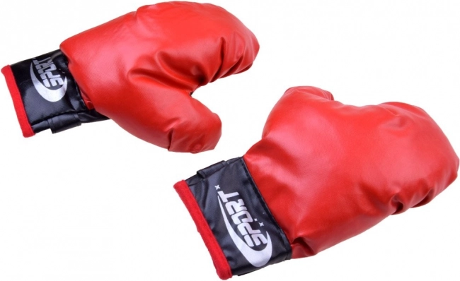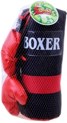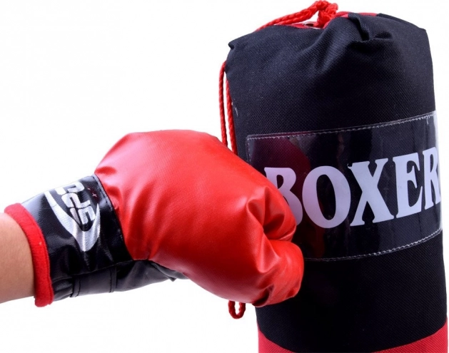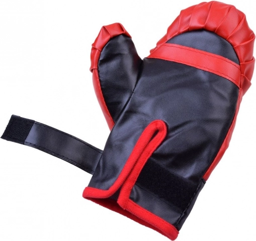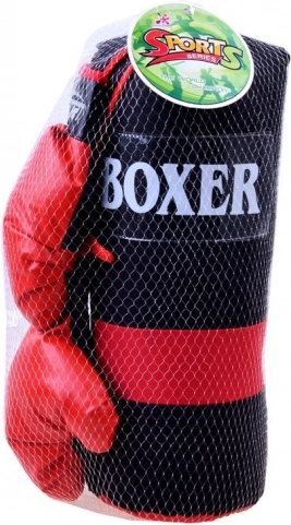 Kompletny zestaw bokserski do treningu domowego i zabawy. Zawiera 2 rękawice bokserskie oraz wiszący worek treningowy. Rękawice z syntetycznej skóry z zapięciem na rzep zapewniają wygodne i bezpieczne dopasowanie. Worek jest mocno przeszyty, zawieszany na metalowych oczkach z linkami. Idealny do rozwijania koordynacji, szybkości i zwinności.
