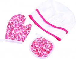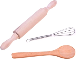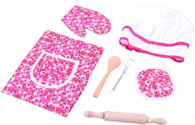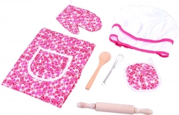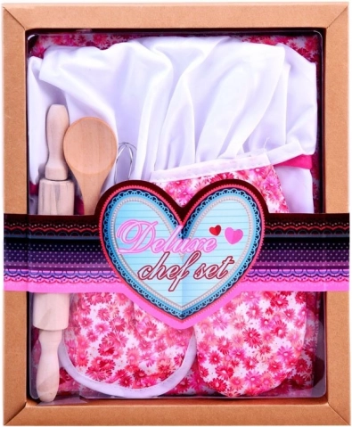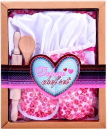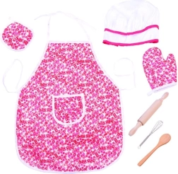 Zawiera wszystkie niezbędne elementy dla małej kucharki: fartuch, czapkę, rękawicę, podkładkę i narzędzia kuchenne.