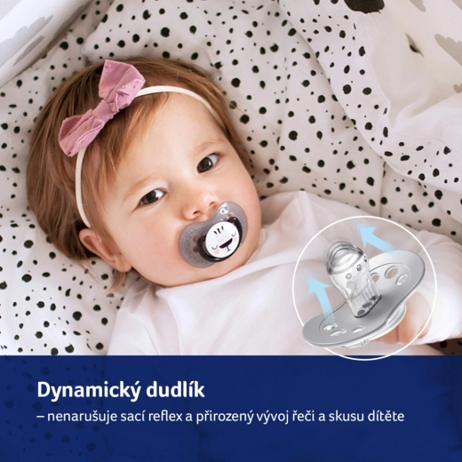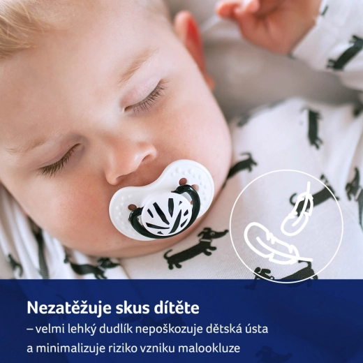 Końcówka z niejednorodnych warstw silikonu wydłuża się i kurczy zgodnie z rytmem ssania, wspiera zdrowy rozwój i nie deformuje podniebienia.