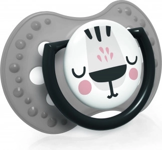 Ergonomicznie wyprofilowana, wcięta tarczka z dużymi otworami wentylacyjnymi umożliwia swobodne oddychanie nosem i ogranicza gromadzenie śliny, zapobiegając podrażnieniom wrażliwej skóry. Bezpieczny silikon jest bezsmakowy i bezzapachowy, łatwy w czyszczeniu i trwały. Praktyczny uchwyt z kółkiem ułatwia podawanie i przypięcie łańcuszka, a podróżne etui utrzymuje smoczki w higienicznej czystości.