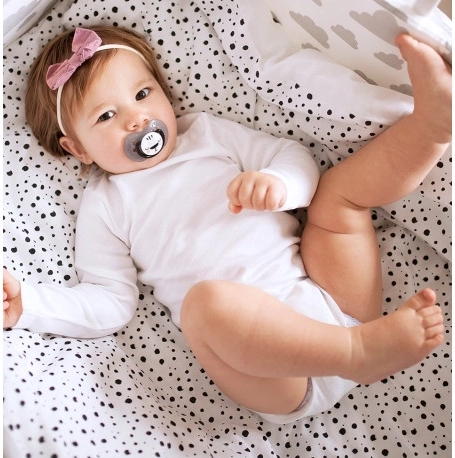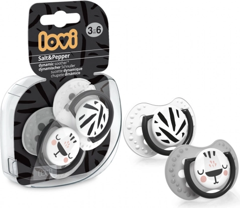 Designerski smoczek LOVI z kolekcji Salt & Pepper dla maluszków 3–6 miesięcy łączy symetryczną, dynamiczną końcówkę dla naturalnego ssania, bezpieczny silikon bez BPA oraz wentylowaną tarczkę delikatną dla skóry. W zestawie znajdują się 2 smoczki i higieniczne etui.