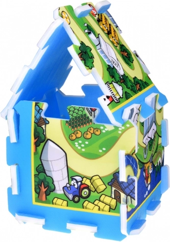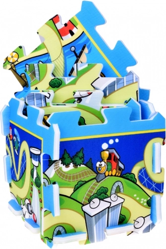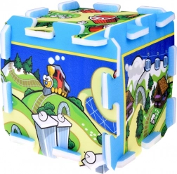 Każdy element ma brzeg typu puzzle dla szybkiego łączenia bez ślizgania. Z maty można też zbudować kostkę 3D lub proste domki, więc zabawa przechodzi z płaskiej w przestrzenną. Odpowiednia do pokoju dziecięcego, na taras i do ogrodu.