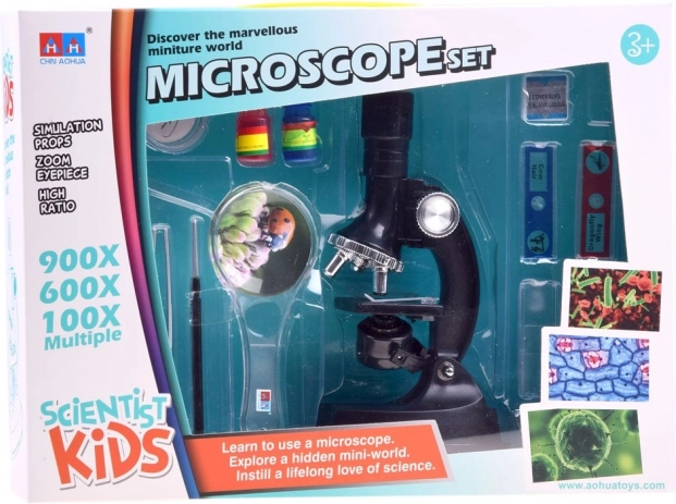 Odkryj mikrokosmos z dziecięcym zestawem mikroskopowym, który oferuje powiększenie 100×/600×/900×, bogate akcesoria i łatwą obsługę. Idealny jako pomoc dydaktyczna do szkoły i domu – rozwija ciekawość, myślenie naukowe i motorykę małą. Zasilanie zapewniają 2× baterie AA (brak w zestawie).