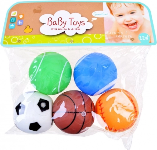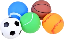 Ten urozmaicony zestaw zawiera pięć kolorowych gumowych piłeczek inspirowanych ulubionymi sportami: piłką nożną, koszykówką, tenisem, baseballem i futbolem amerykańskim. Dzięki zintegrowanej wkładce piszczącej po naciśnięciu rozlega się zabawny dźwięk, który pobudza dziecięcą ciekawość i rozwija małą motorykę.