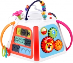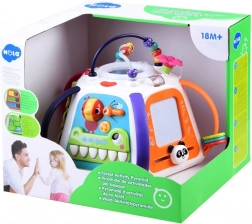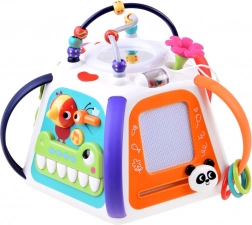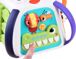 Po włączeniu kostka uruchamia melodie, efekty dźwiękowe i świetlne, które motywują dzieci do dalszej eksploracji. Nie brakuje pianinka w formie krokodylich ząbków, elementów ruchomych, przesuwnych paneli z optycznym efektem „żywej” animacji ani bezpiecznego lusterka.