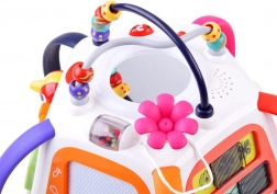 melodie, efekty świetlne, dźwięki zwierząt, pianinko, lusterko, przesuwane panele z efektem optycznym, zębate kółeczka, znikopis