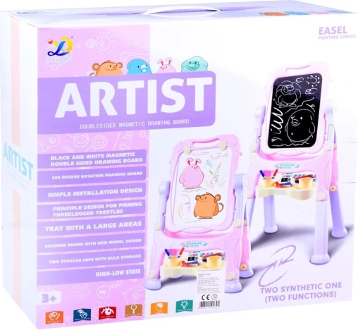 Ta kolorowa dwustronna tablica oferuje wszystko dla małych artystów: po czarnej stronie można pisać kredą, biała magnetyczna strona nadaje się do markerów suchościeralnych, magnesów lub przypinania papierów do malowania. Praktyczna półeczka i kubeczki utrzymują kredy, markery i pędzle zawsze w zasięgu ręki.