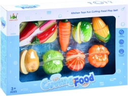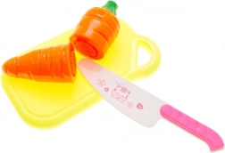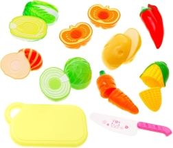 W komplecie deska do krojenia, nóż i barwny wybór warzyw do kreatywnej zabawy w gotowanie.