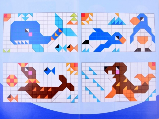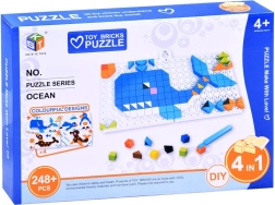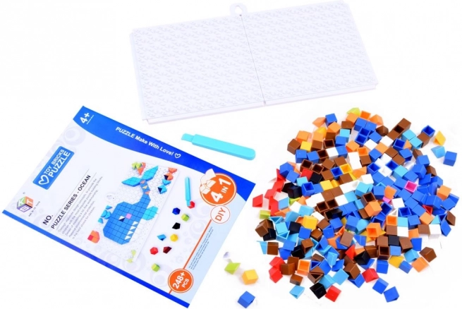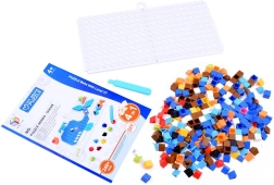 Zestaw zawiera 248+ kolorowych klocków do tworzenia barwnych mozaik. Dzieci mogą układać motywy z wzorów (np. zwierzęta czy sceny oceaniczne) lub wymyślać własne obrazki.