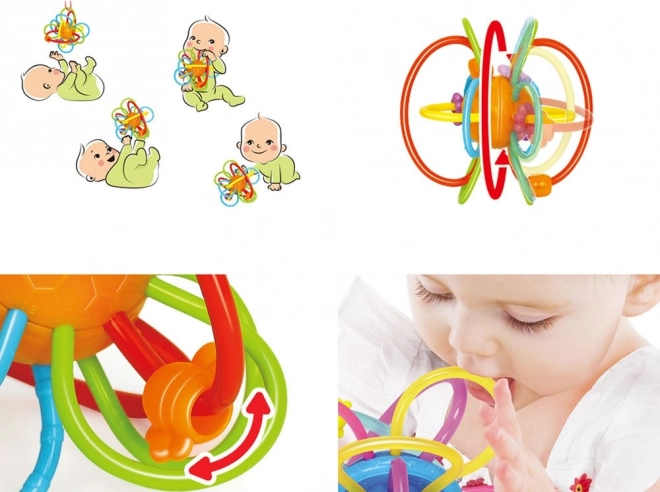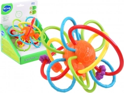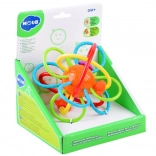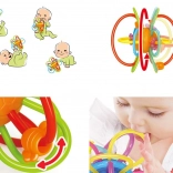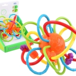 Przeplatające się kółeczka z elastycznego plastiku dobrze leżą w małej dłoni, trenują chwyt i koordynację ręka–oko już od pierwszych miesięcy.