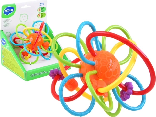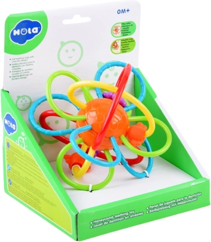 Kolorowy sensoryczny gryzak HOLA z przeplatającymi się pętelkami wspiera chwyt, rozwój małej motoryki oraz percepcję sensoryczną niemowlęcia. Miękkie, elastyczne materiały są bezpieczne dla dziąseł, grzechoczące koraliki stymulują słuch, a żywe barwy przyciągają wzrok.