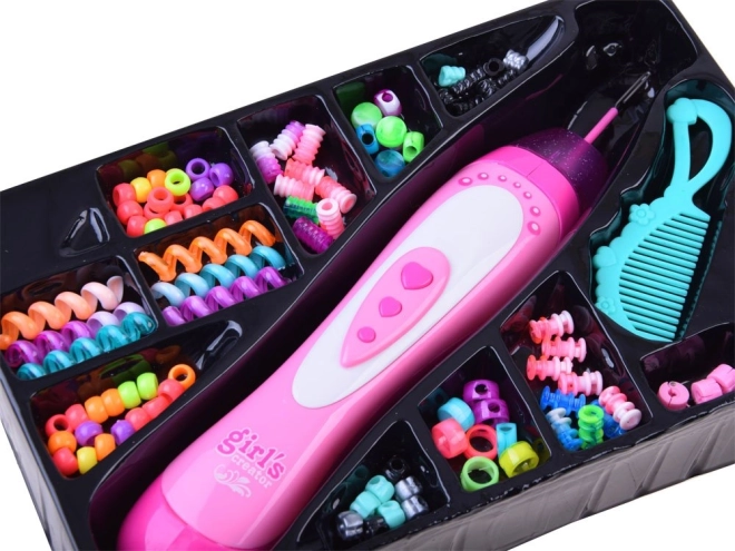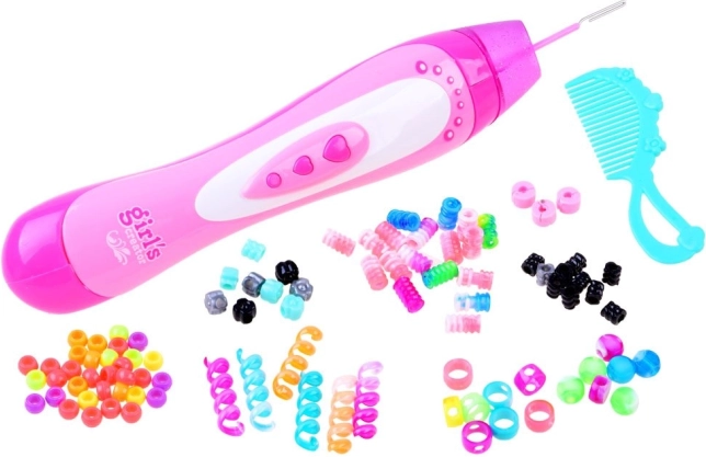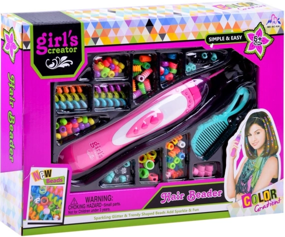 Odkryj łatwe i zabawne zdobienie włosów z tym zestawem Girl's Creator. Ergonomiczny nawlekacz pomoże szybko przymocować koraliki do wybranych kosmyków, dzięki czemu dzieci mogą samodzielnie i bezpiecznie tworzyć barwne stylizacje na każdy dzień. Wystarczy przygotować pasemko, wsypać koraliki do zasobnika i delikatnym naciśnięciem nawlekać je jeden po drugim.