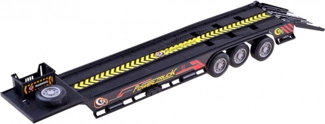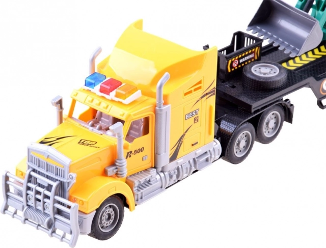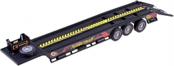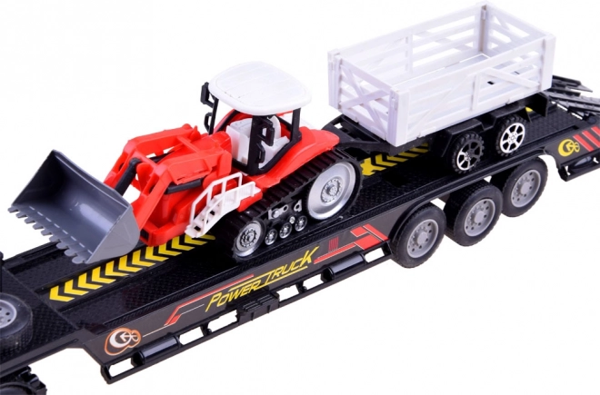 Ciągnik z platformową naczepą bezpiecznie przewozi traktor z przyczepą. Połączenie na długie godziny kreatywnej zabawy.