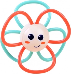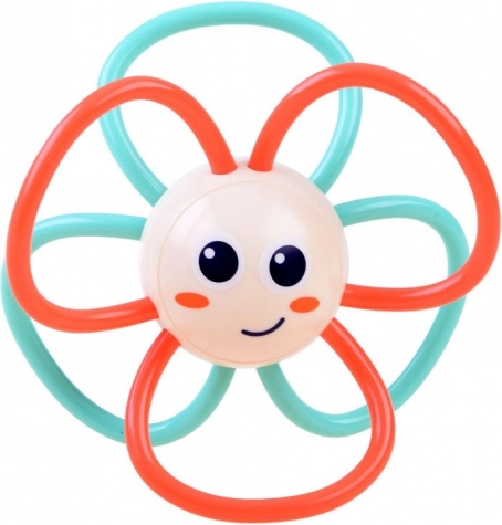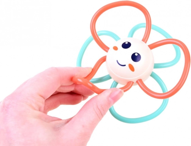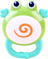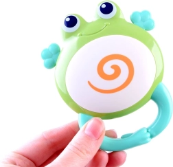 Ta grzechotka ma wesoły design żabki z turkusową rączką i pomarańczowym wirkiem na brzuchu. Oferuje zabawę i stymulację dla dzieci.