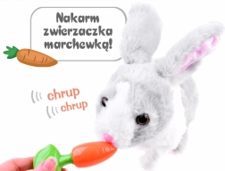 W zestawie znajduje się marchewka. Gdy przyłożysz ją do pyszczka, króliczek wydaje realistyczne odgłosy chrupania – idealne do zabawy w karmienie.